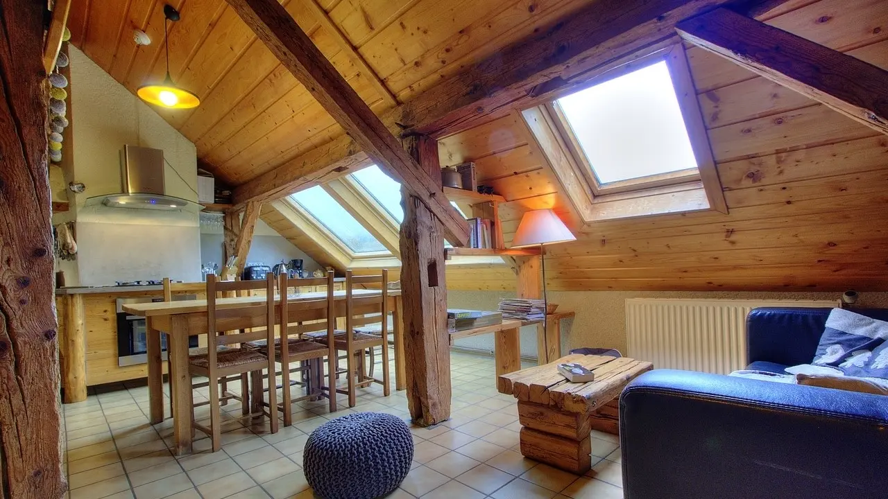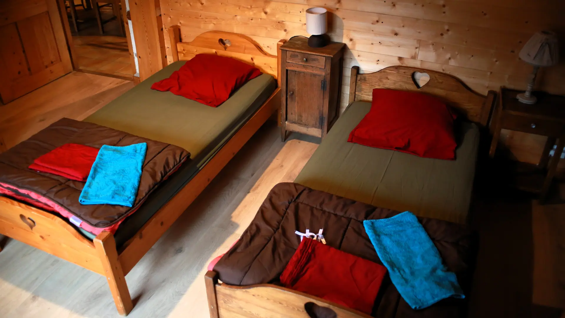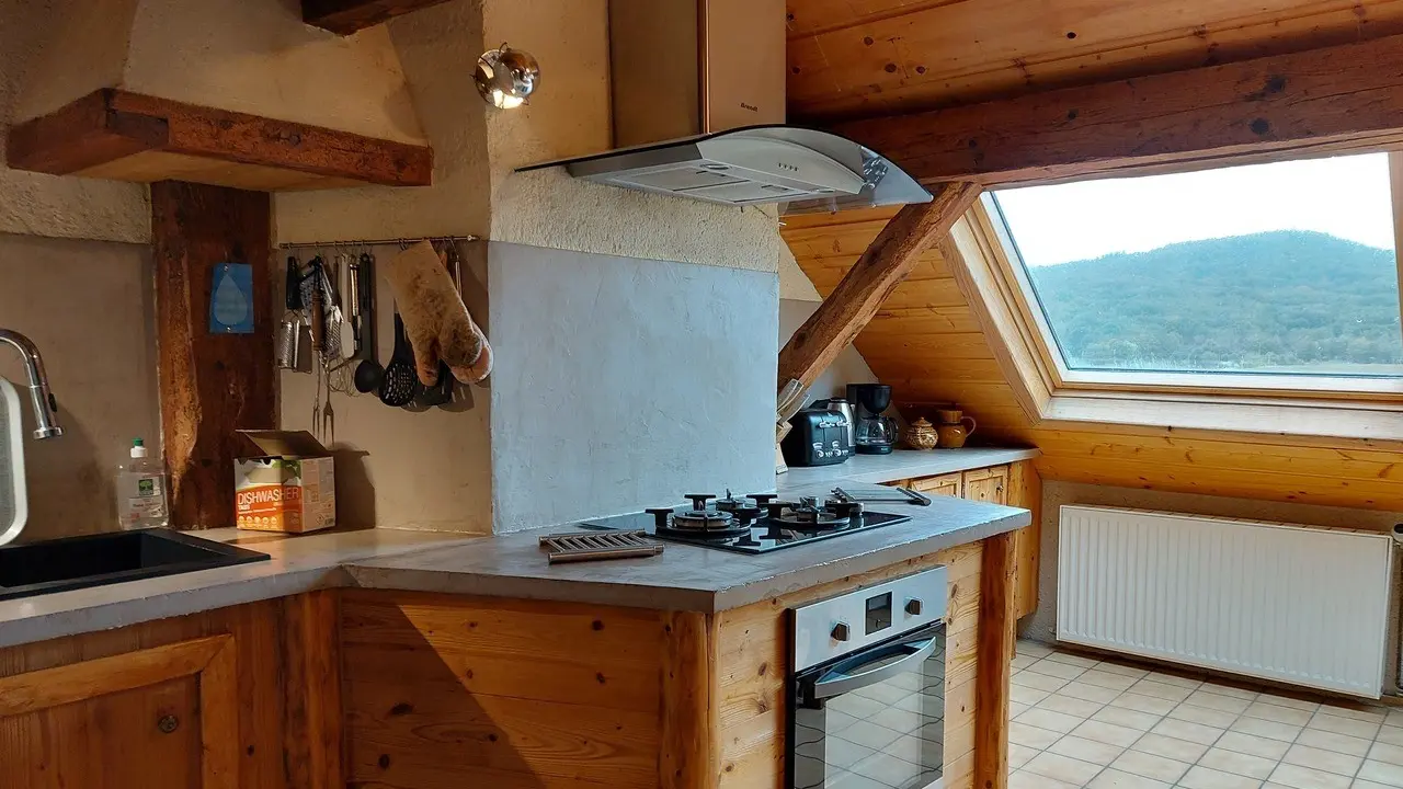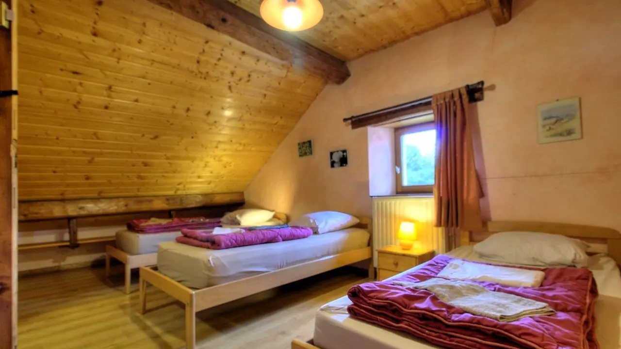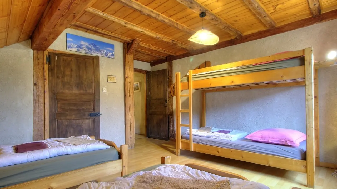 Upstairs, a living room with a beautiful view of the surrounding countryside. Chalet-style decor. Mezzanine with TV area. Comprising 3 bedrooms, 1 with a double bed, 1 with three single beds, and 1 with two single beds and a bunk bed. 3 shower rooms.