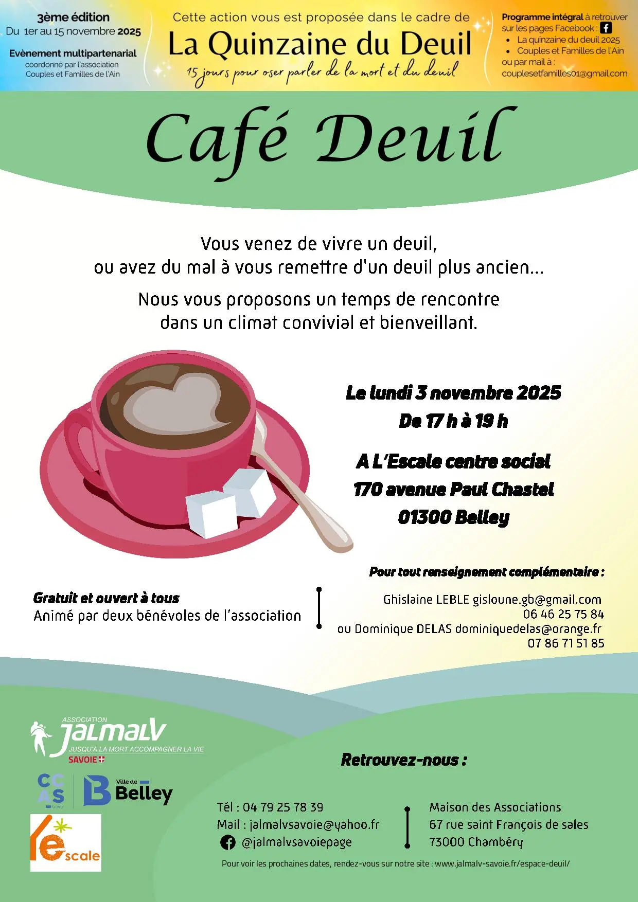 Cette action vous est proposée dans le cadre de la Quinzaine du deuil. 15 jours pour oser parler de la mort et du deuil. Cette rencontre est animée par deux bénévoles de l'association "Jusqu'à la mort accompagner la vie".