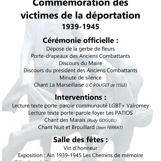 Commémoration nationale des victimes de la déportation guerre 1939-1945 à Virieu le Grand dans l’ancienne cour de l’école, suivi dans la salle des fêtes vin d’honneur + exposition.