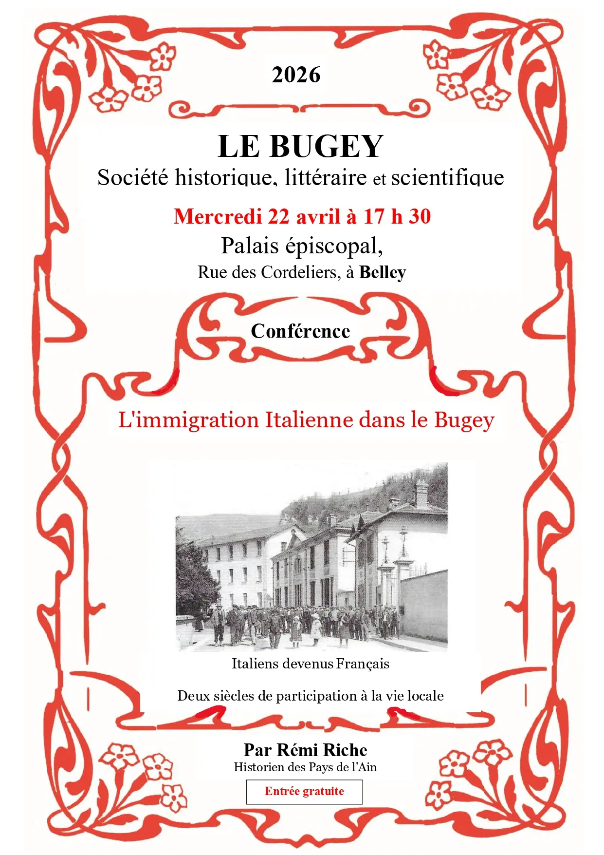 Cette conférence, organisée par la Société historique, littéraire et scientifique du Bugey, explorera l'histoire de l'immigration italienne dans la région du Bugey.