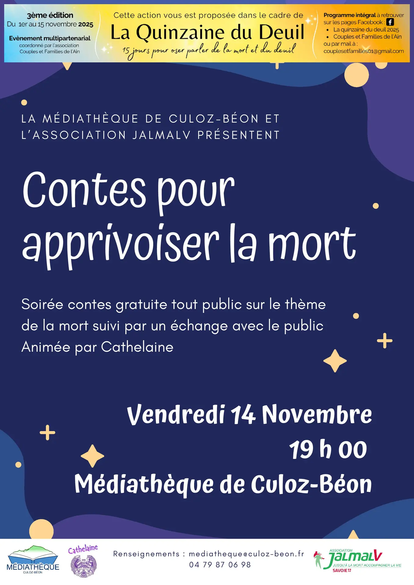 Dans le cadre de la quinzaine du deuil, la médiathèque de Culoz et l'association JALMALV présentent une soirée contes pour apprivoiser la mort animée par la conteuse Cathelaine.
