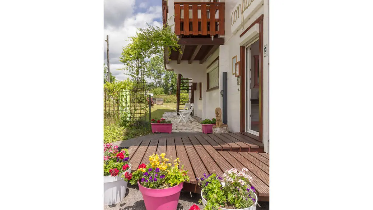 Par un escalier extérieur donnant sur un un grand balcon de 13m², vous accédez à une cuisine ouverte toute équipée et sur l'espace séjour / détente contenant un couchage (clic-clac). Deux chambres composent ce logement : une chambre avec un lit double et une chambre avec un lit double et un lit simple.