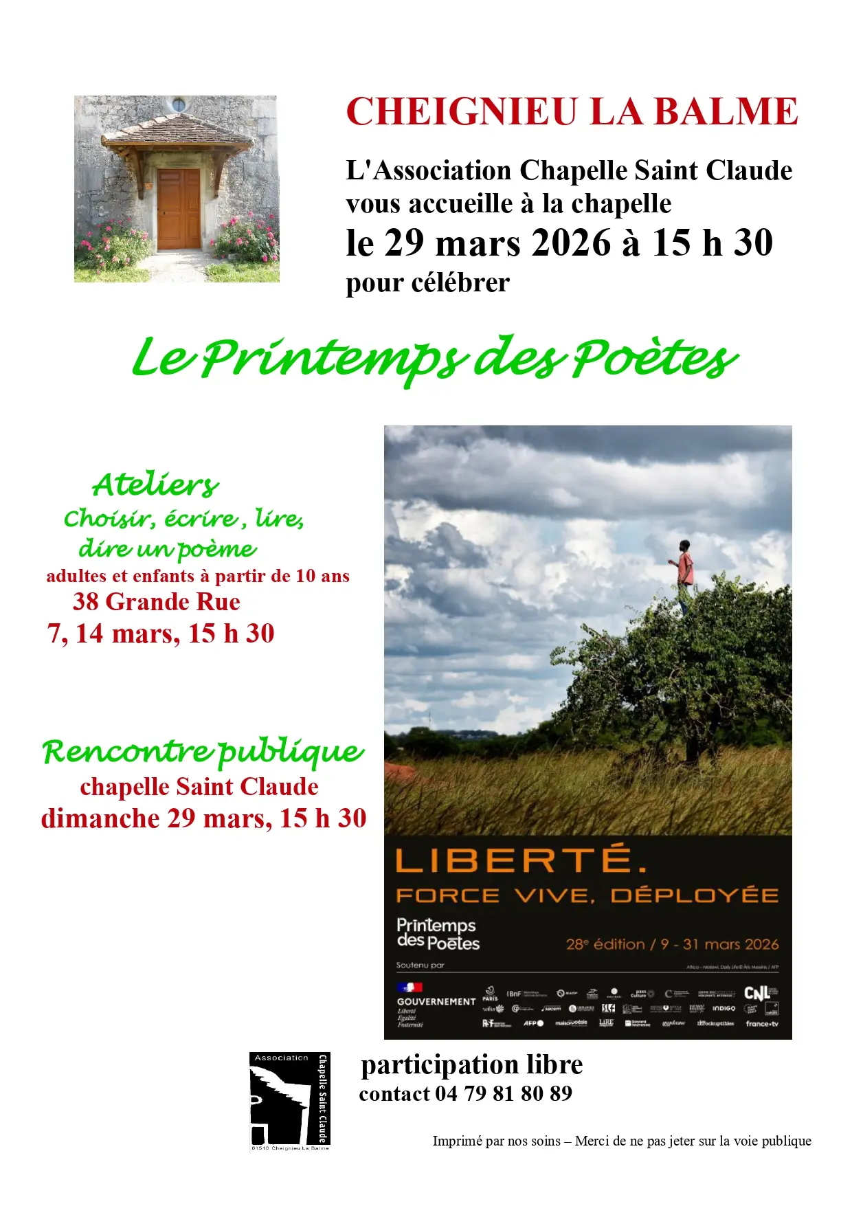 L'Association Chapelle Saint Claude vous accueille à la chapelle pour célébrer Le Printemps des Poètes.