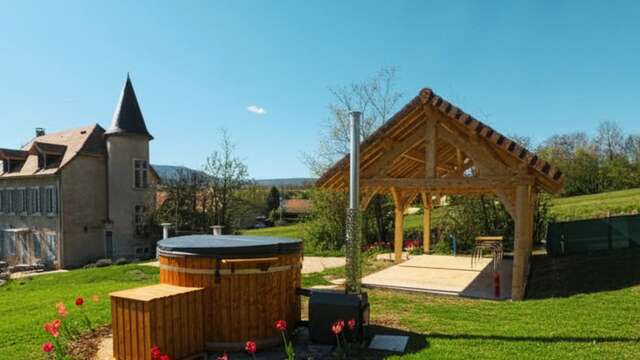Le premier gîte, La Perle du Bugey, situé au rez-de-chaussée du manoir, peut accueillir jusqu’à 6 personnes. Il offre des espaces de vie confortables et élégants, une décoration soignée mêlant meubles anciens et équipements modernes, ainsi qu’un accès direct aux extérieurs. Ce gîte dispose de sa terrasse privative avec espace repas et de son bain nordique privatif, idéal pour se détendre en toute intimité.
