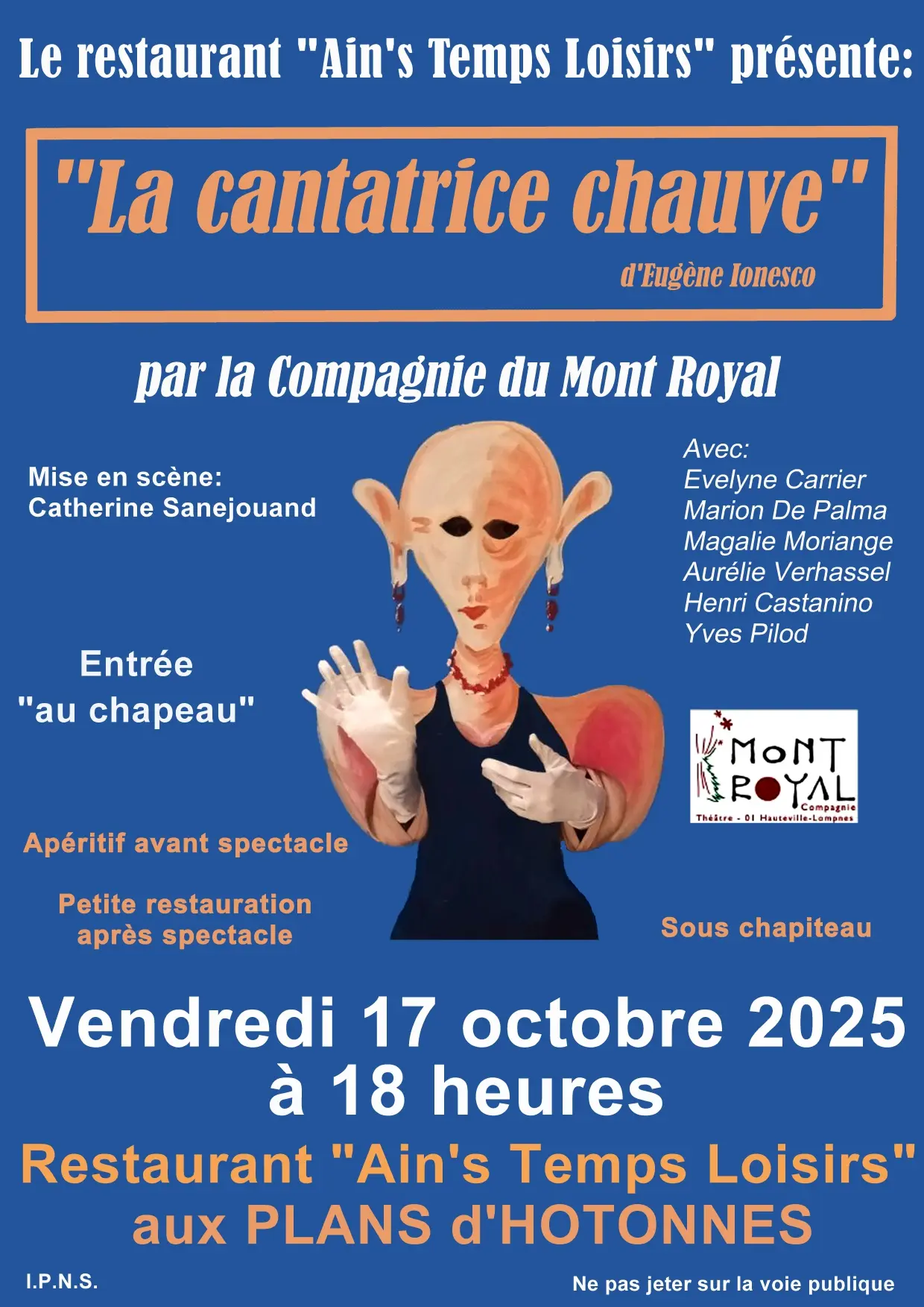 Ain'sTemps Loisirs et la Compagnie du Mont Royal vous proposent une adaptation burlesque et décoiffante par Catherine Sanajuand du monde déglingué d'Eugène Ionesco à travers sa Cantatrice chauve, “anti-pièce” la plus jouée dans le monde.