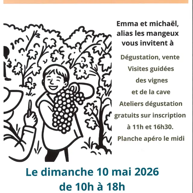 Emma et Michaël, alias les mangeux, vous invitent à des dégustations, ventes, visites guidées des vignes et de la cave, ainsi que des ateliers dégustation gratuits.