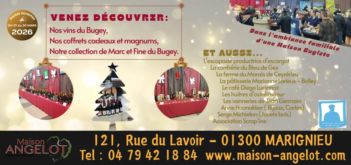 La Maison Angelot ouvre ses portes pour vous faire découvrir leurs vins du Bugey, les coffrets cadeaux et magnums, et leur collections de Marc et Fine du Bugey.