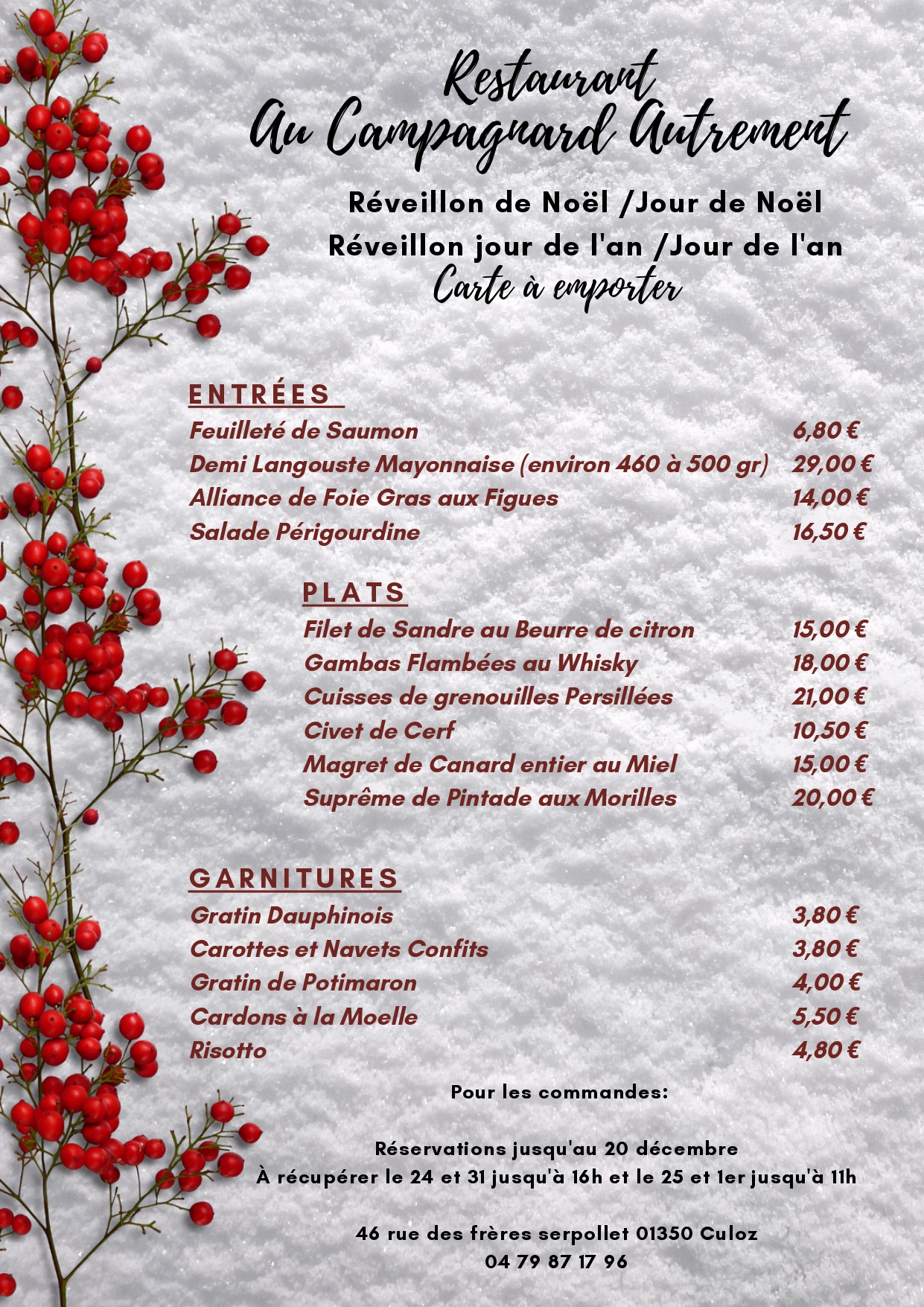 Plats du jour à emporter, du lundi au vendredi, uniquement sur réservation par téléphone