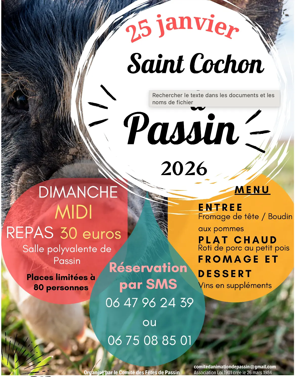 Repas convivial de la Saint-Cochon organisé par le comité des fêtes de Passin. Réservation par SMS, places limitées.