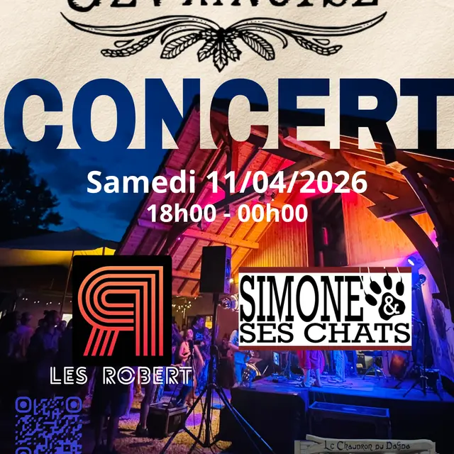 Soirée concert rock à La Gevrinoise avec Les Robert (5 ans du groupe) et Simone et ses Chats. Deux sets live, restauration sur place et ambiance conviviale garantie.